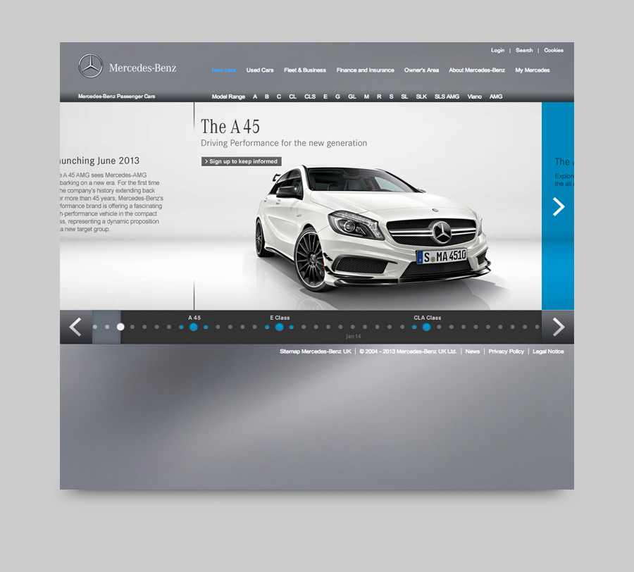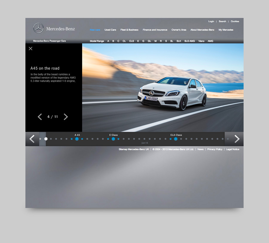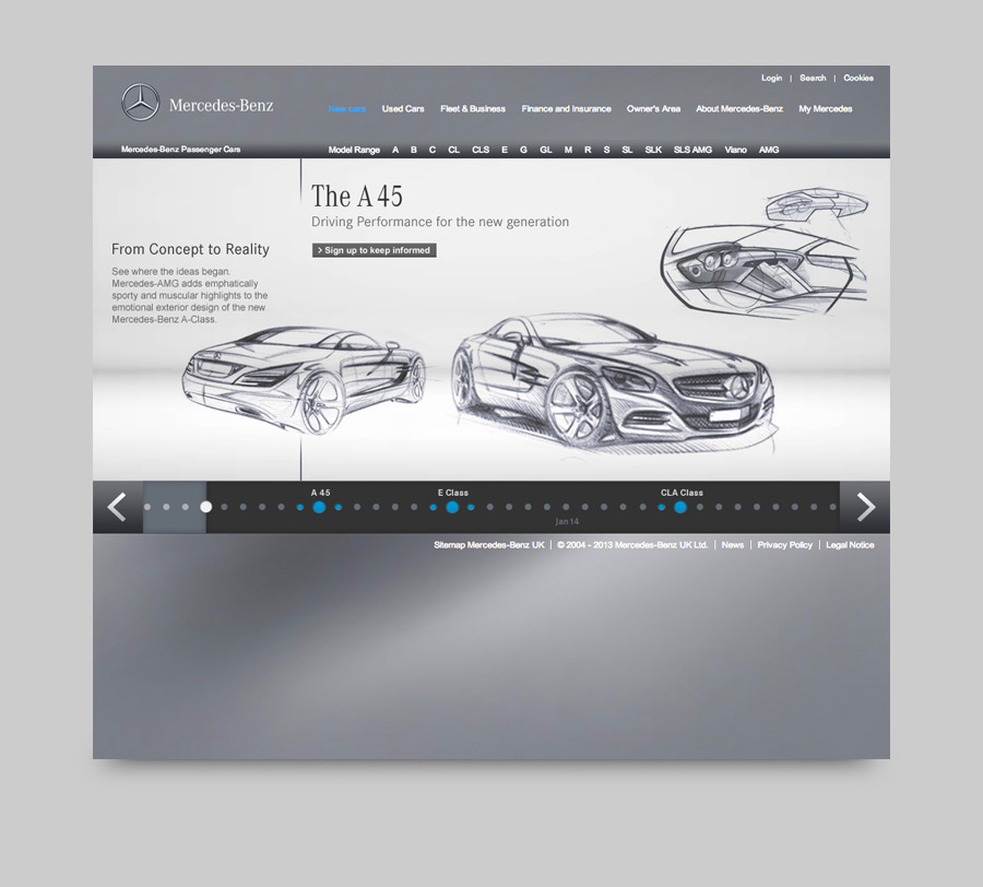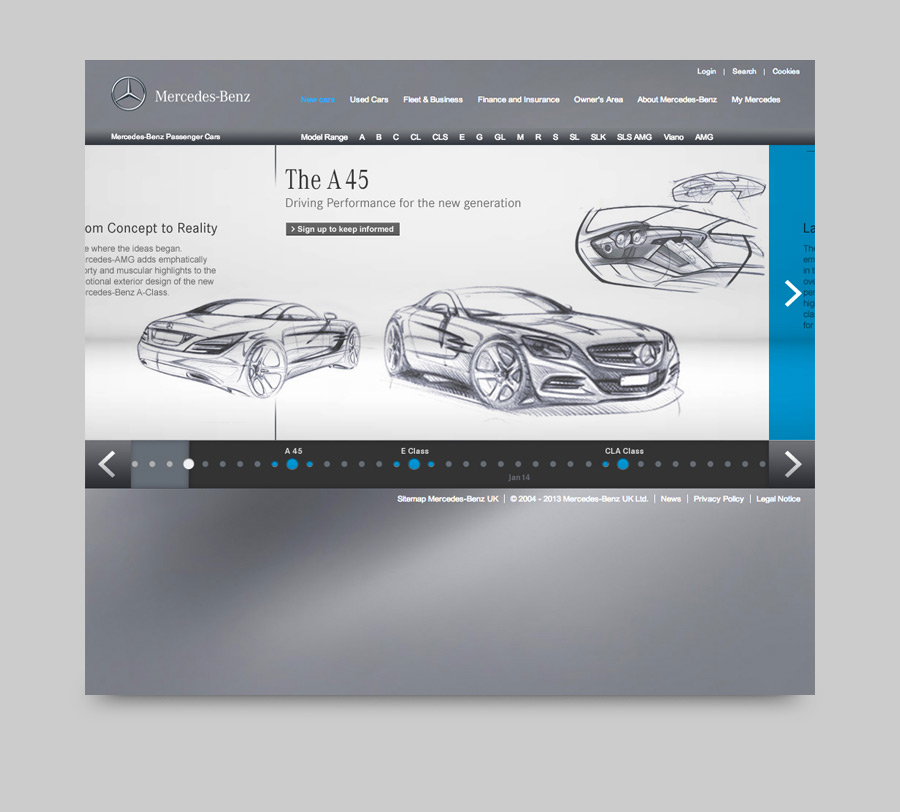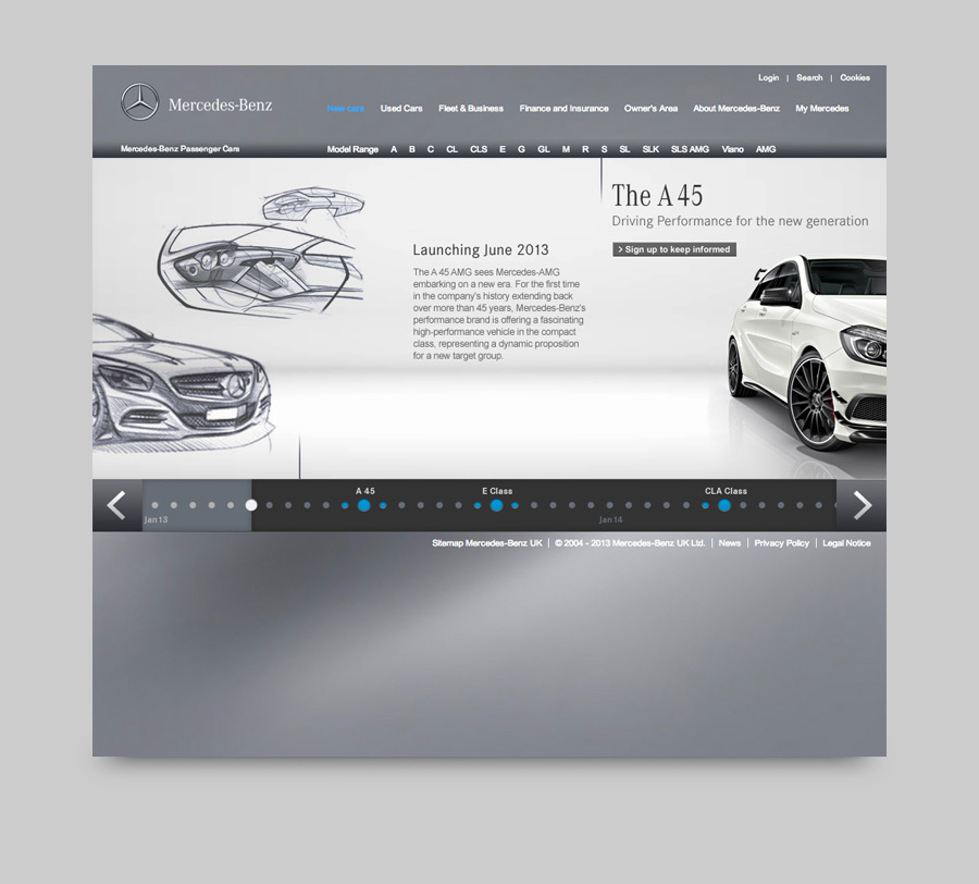 I was asked to create a visual concept and user experience for a new section of the Mercedes-Benz website, to illustrate the dates of new car launches. The final solution was a parallax display using a timeline navigation to access the digital content, from design drawings to live footage of cars in action.