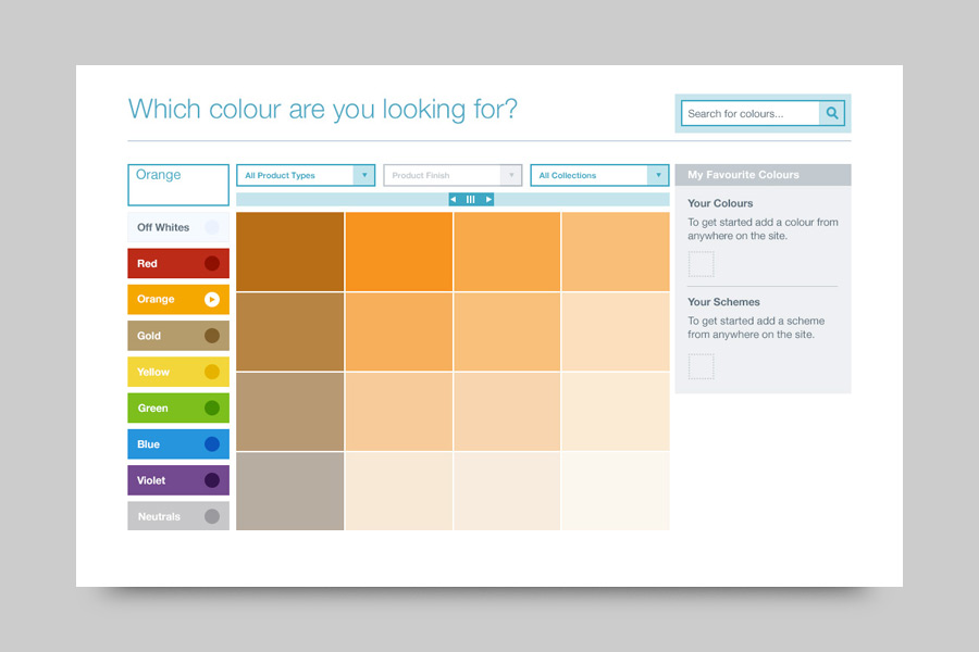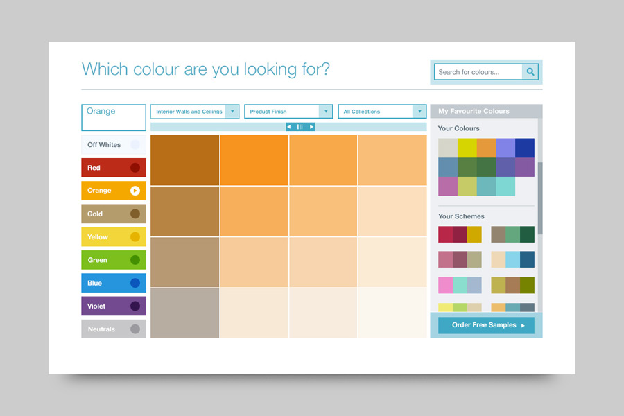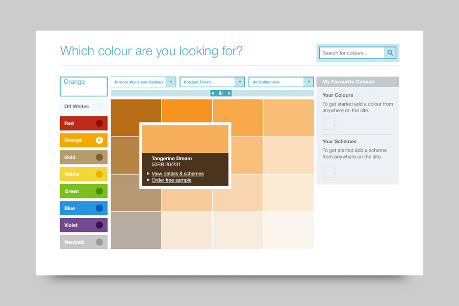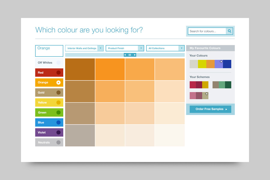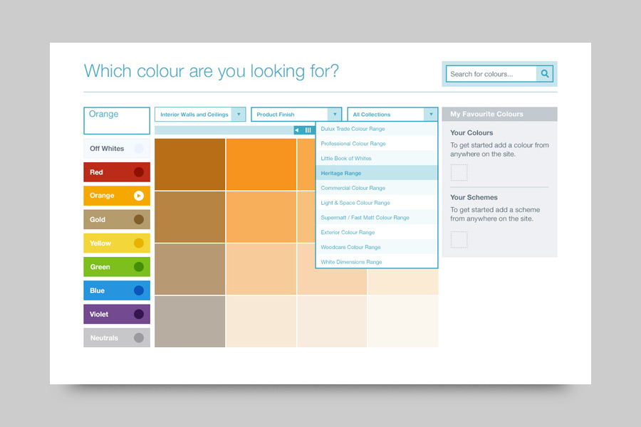 I was asked to redesign an online tool and related web pages for searching and collating paint samples from the Dulux Trade range. Creating a functional user journey, to simplify the process for accessing the vast range of colours available, so users can easily generate a collection of swatches that can be saved or sent to them by post.