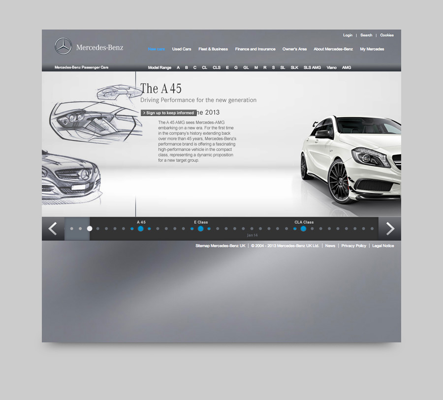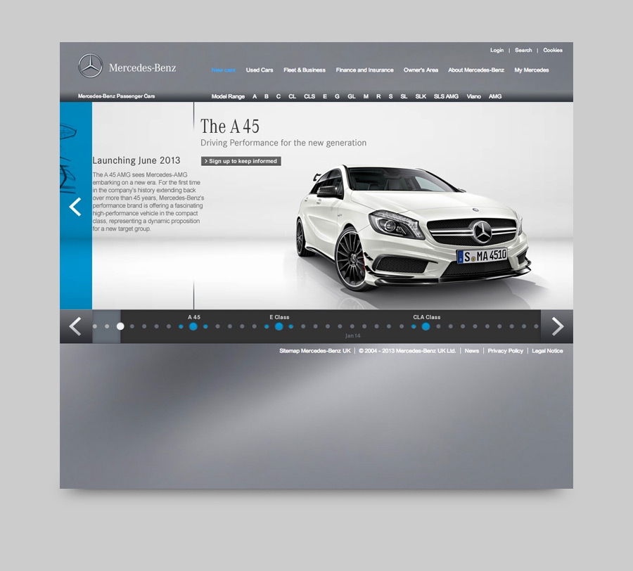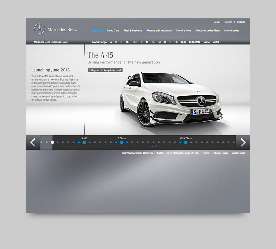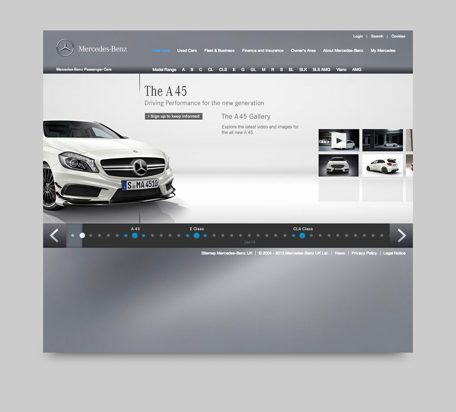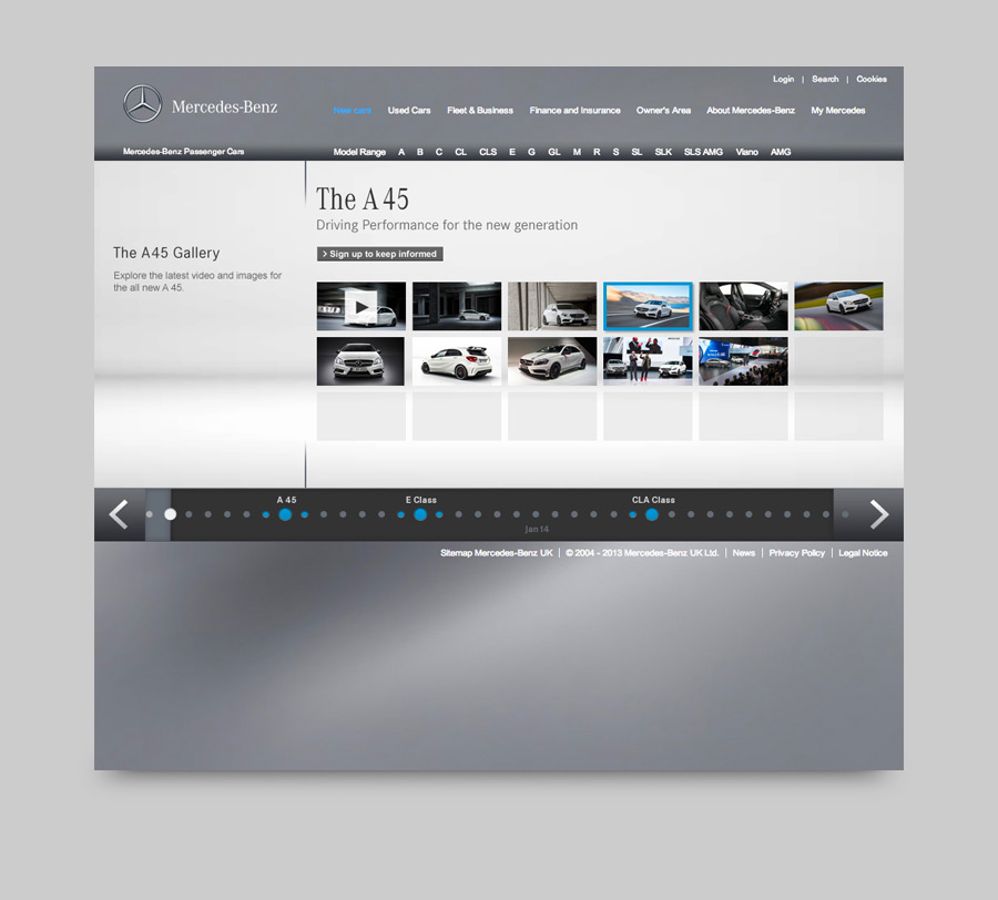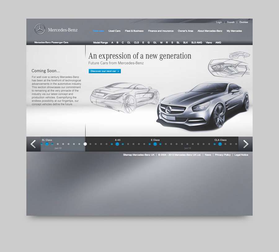 I was asked to create a visual concept and user experience for a new section of the Mercedes-Benz website, to illustrate the dates of new car launches. The final solution was a parallax display using a timeline navigation to access the digital content, from design drawings to live footage of cars in action.
